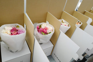 お花の良さを引き立てるよう、シンプルな白のペーパーに、リボンの代わりにWABARAオリジナルのベルクロ(面ファスナー)を巻いてお届けしています。