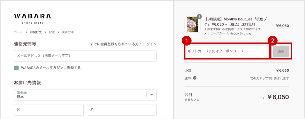 決済画面にて「ギフトカードまたはクーポンコード」入力欄に用意していたギフトカードページのコードを入力し、「適用」をクリック。eギフトカードの金額が反映されたことを確認し、決済してください。
