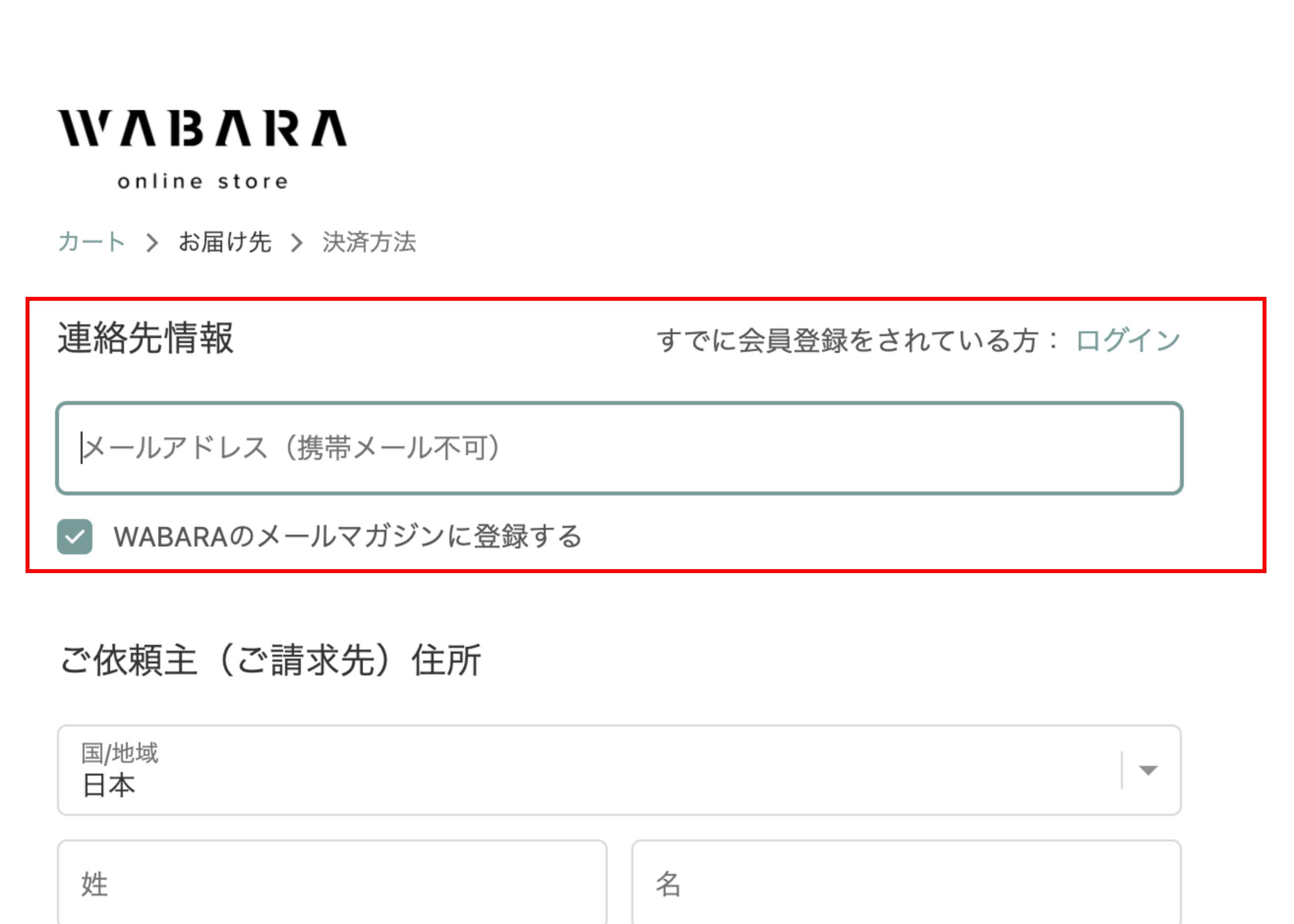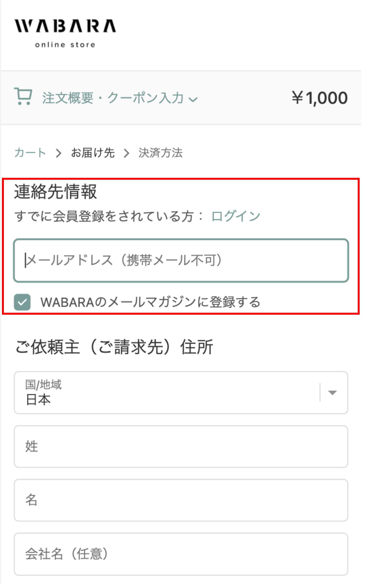 カートに追加後「お届け先の入力」に進みます。連絡先・お届け先情報は、贈り先ではなく、ご購入者さまのメールアドレスをご記入ください(購入完了の明細メールも自動送付されるため、ご注意ください)。画面の表示にしたがい、お支払いまで完了してください。