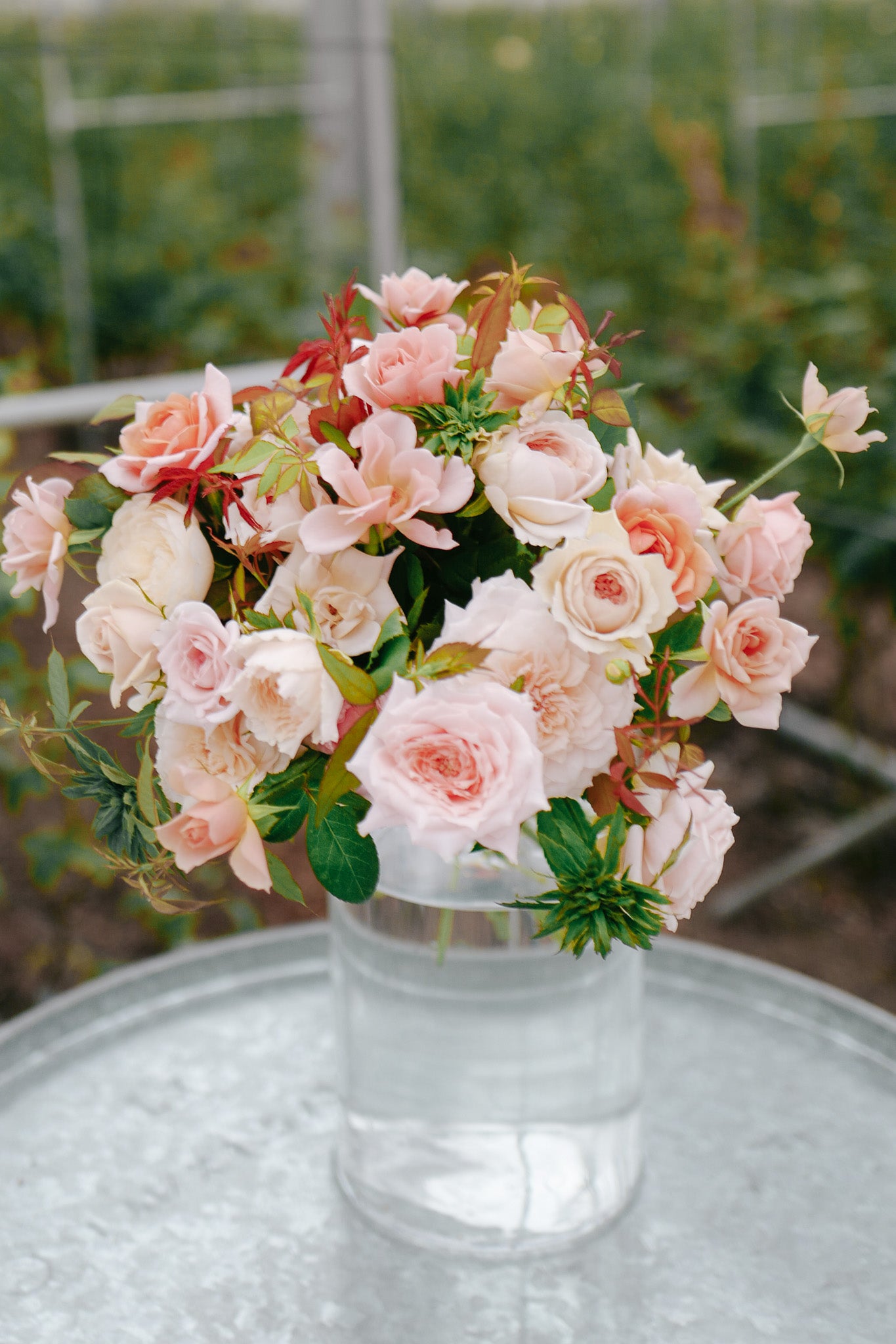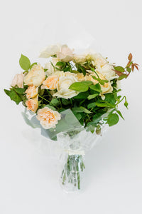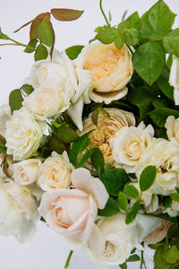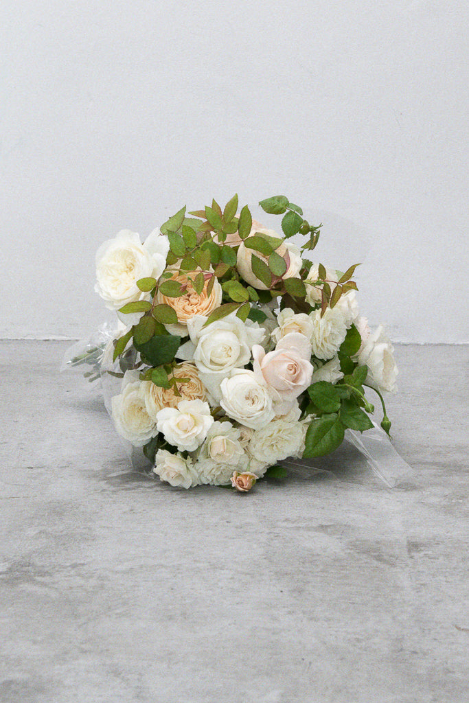 農園で育つばらたちの姿そのものを表現すべく、お花だけでなくばらの枝葉を入れてつくるわばらの花束。