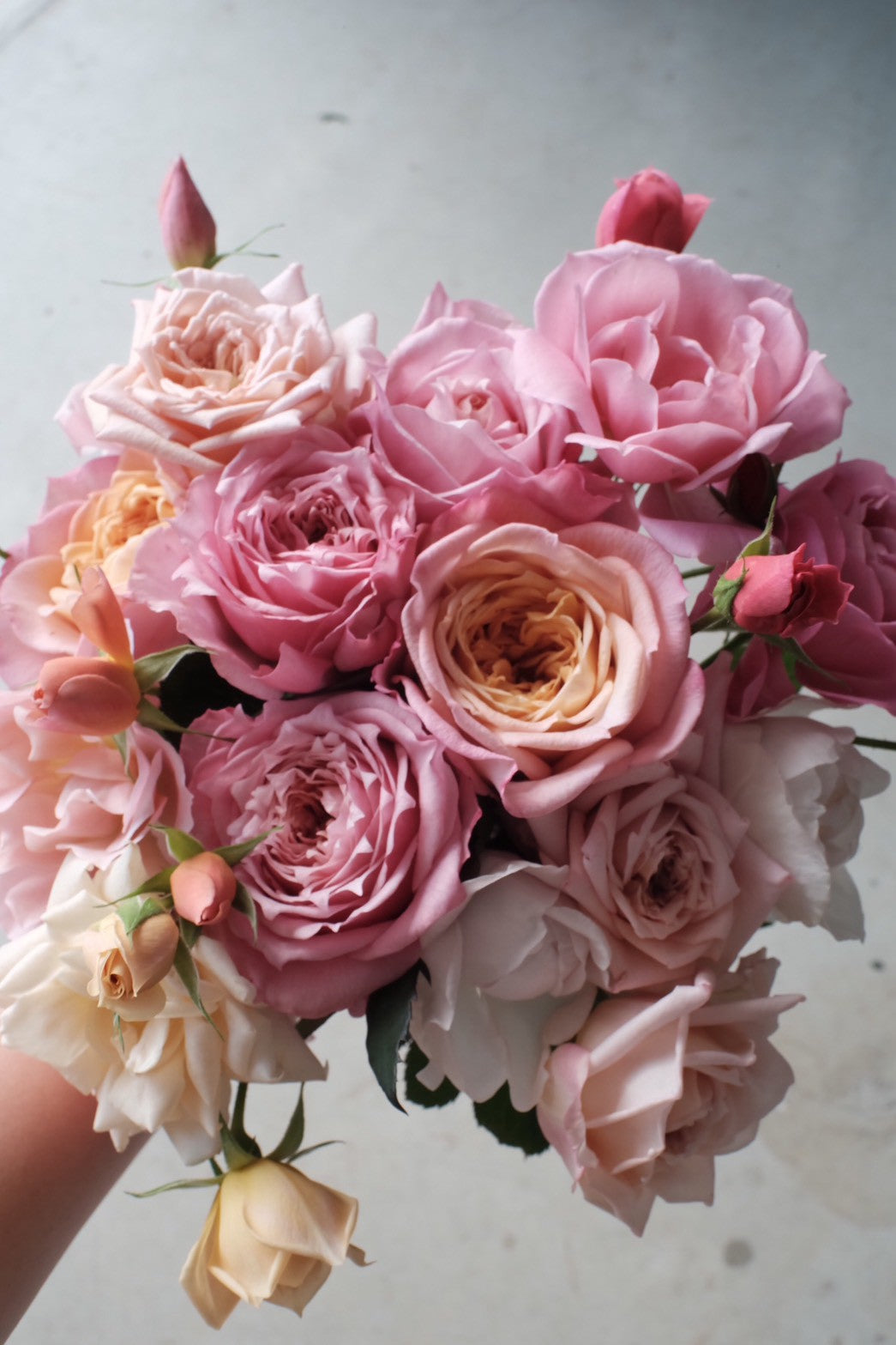 ・新品種のブーケ01 新品種4種とベージュとくすみピンクのばらを合わせて束ねたブーケ
